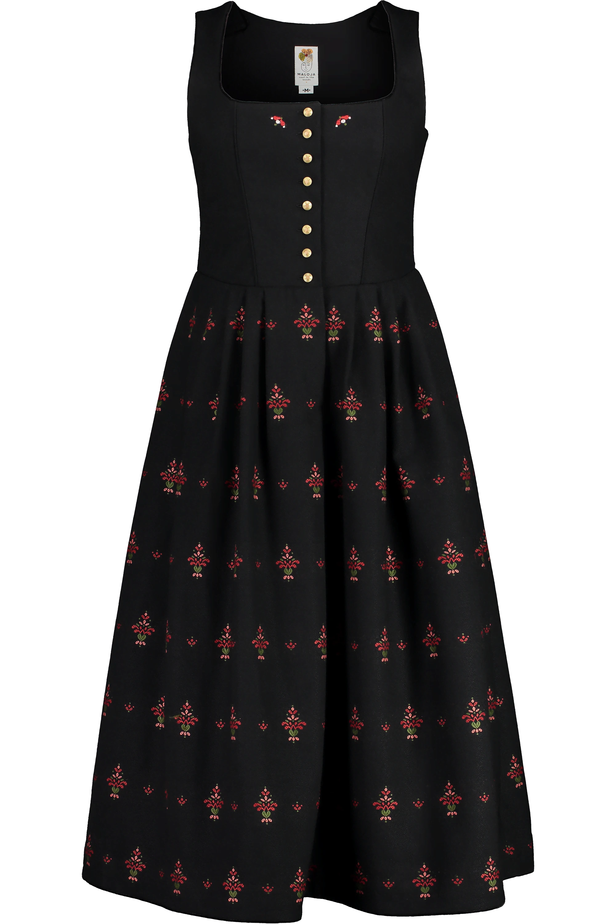 maloja RosmarieM ist ein hochwertiges Dirndl aus reiner Schurwolle mit einem geringen Spandexanteil. Der mit einem hübschen Muster gewebte Stoff ist durch die Wolle gleichzeitig weich und warm und dennoch atmungsaktiv. Das klassisch feminine Dirndl hat eine durchgehende Knopfreihe vorne und ein grosses Blumen-Motiv am Rücken. RosmarieM wird auf jedem Fest alle Blicke auf sich ziehen.